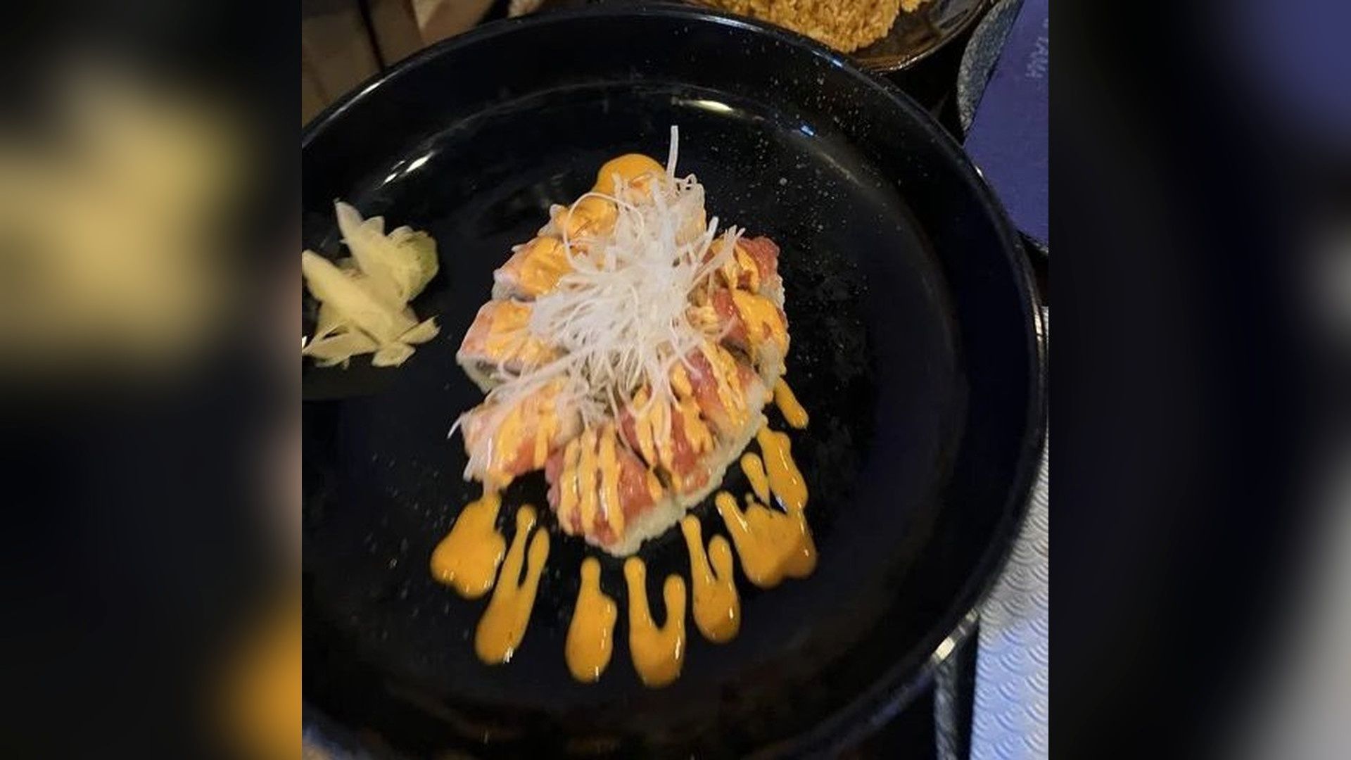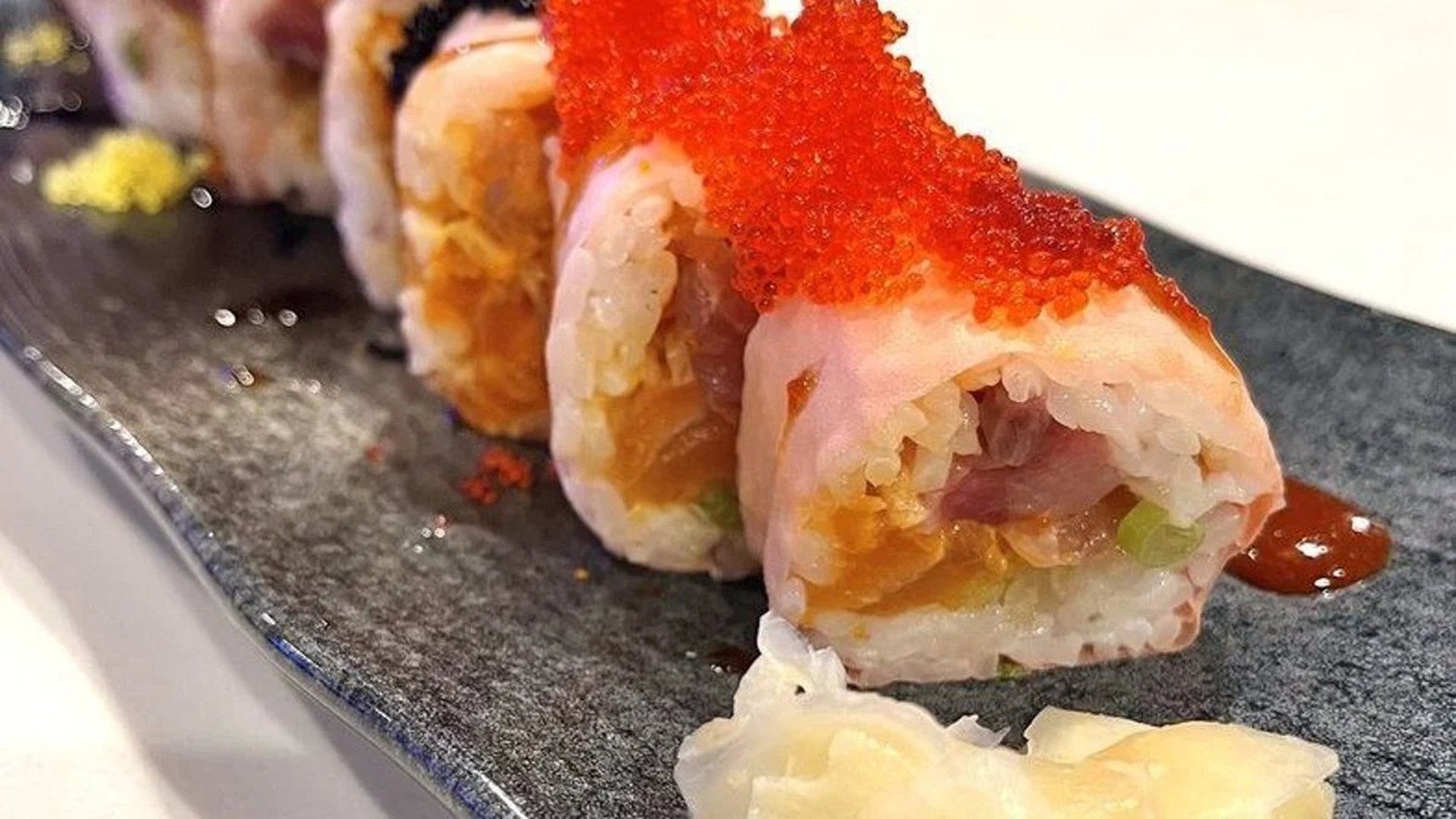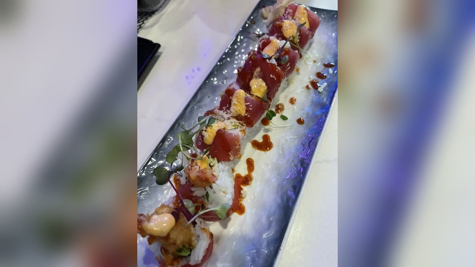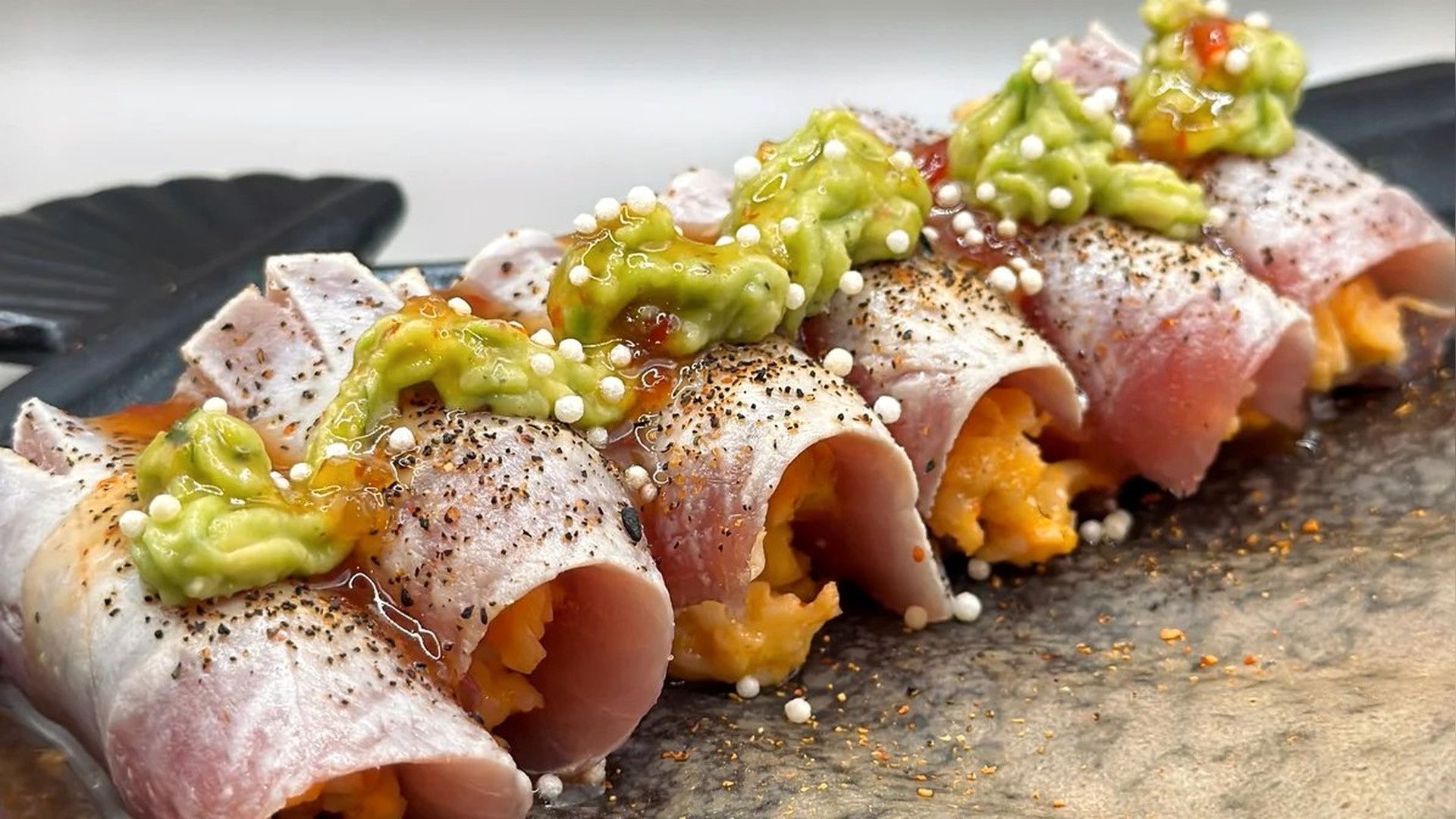 shrimp tempura avocado masago inside, fresh tuna on top with spicy Mayo torched