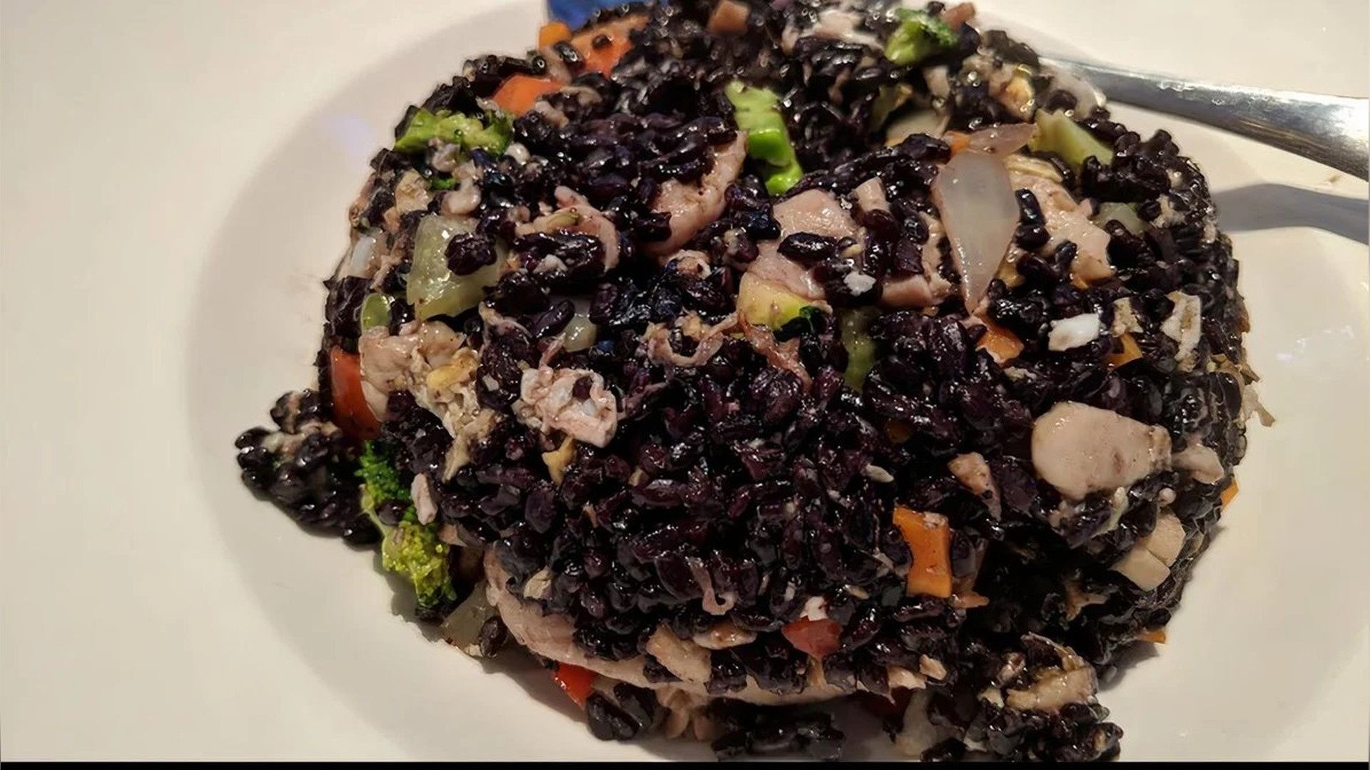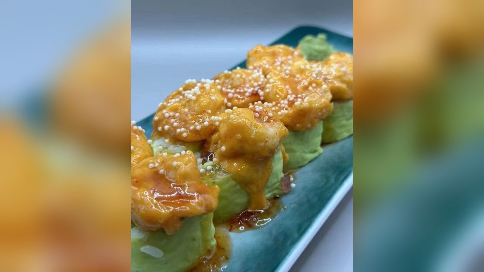 Spicy tuna, avocado inside, soy paper outside. topped with Bang Bang shrimp & drizzled with mango salsa, rainbow mix decoration.