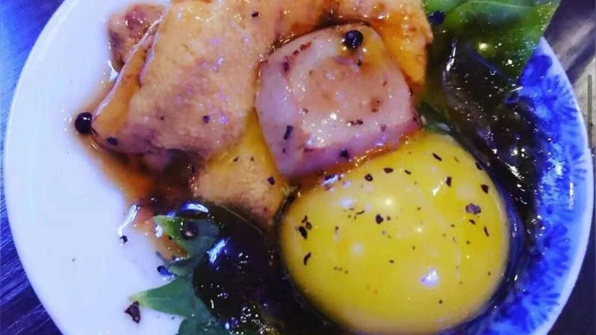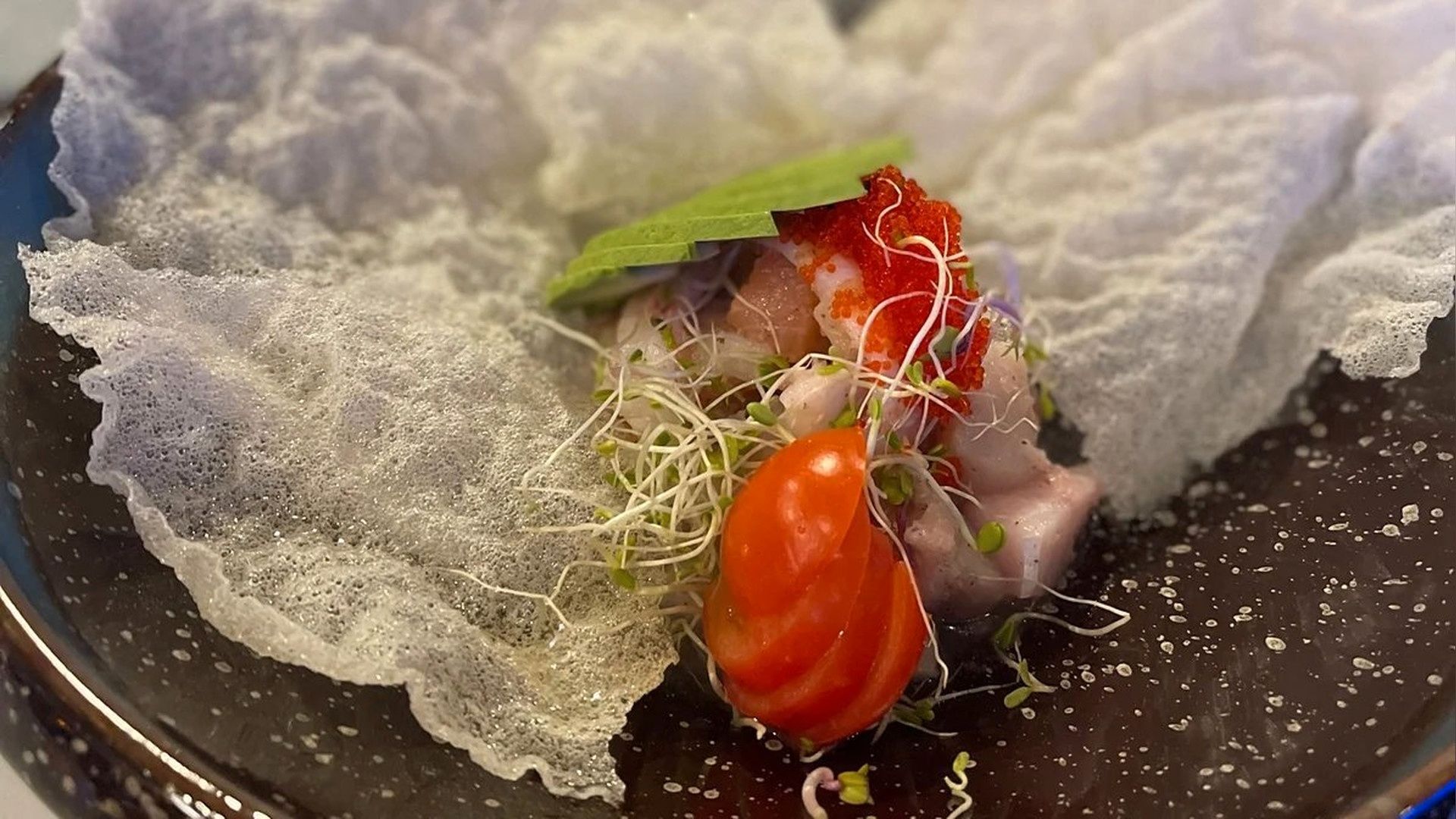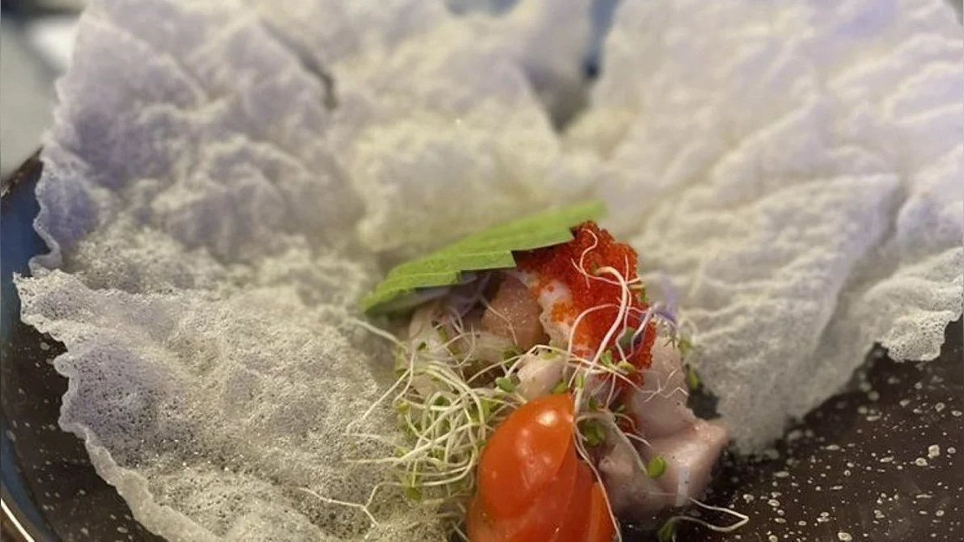 and ornge toped wih kurl shisoleaves and chef's special citrus sauce