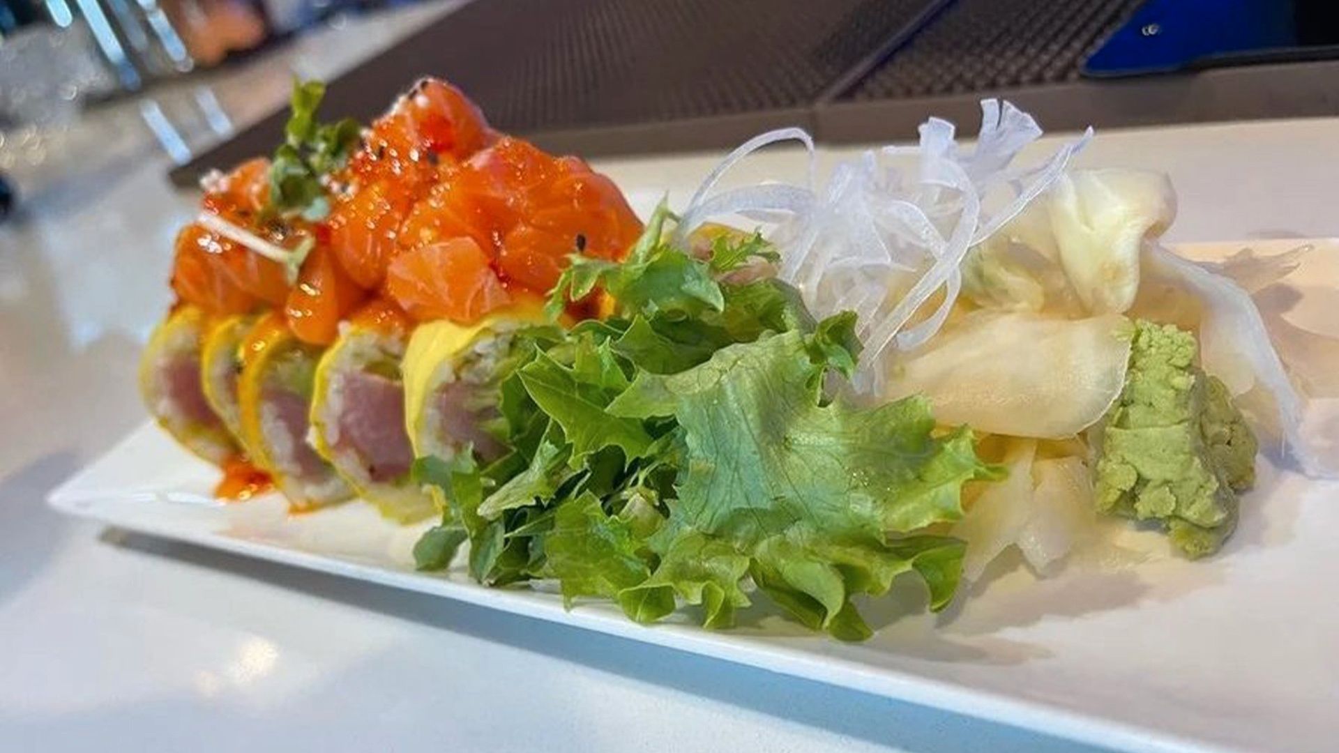 Inside: Yellowtail, scallion,avocado. Soy paper outside. On top: diced salmon. Drizzled with mango sauce