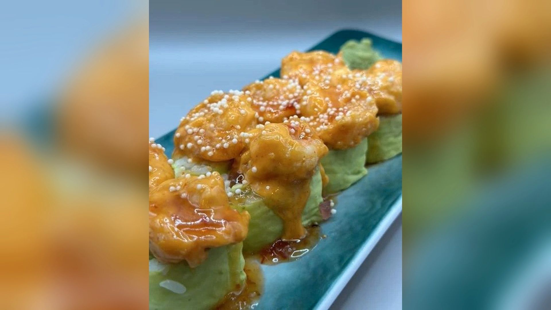 Ebi, avocado, mango inside. soy paper outside. topped with fried scallops, masago, spicy mayo