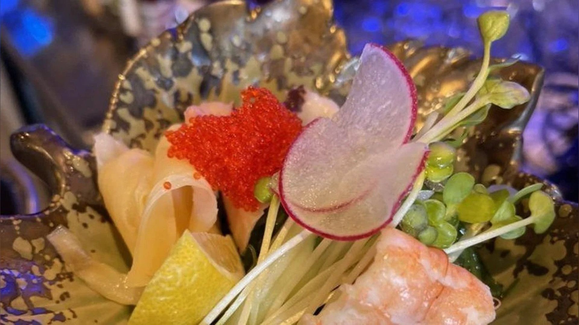 Ebi, avocado, mango, lemon inside, rice outside. Topped with salmon, decorated with ikura