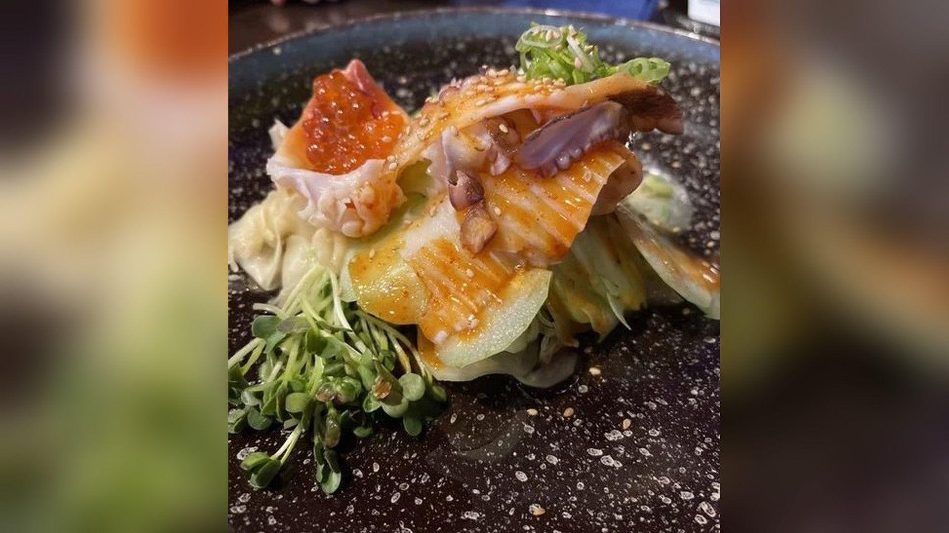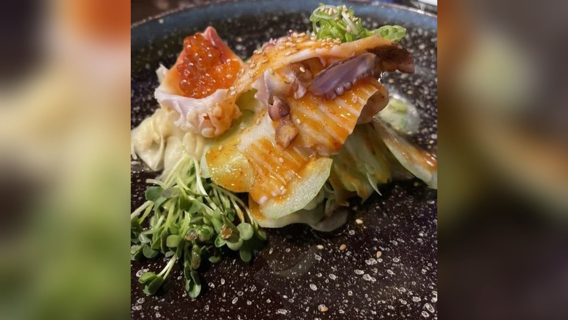 Sliced conch & octopus, sliced cucumber, garnished with Kani stick and Ebi, with spicy ponzu sauce