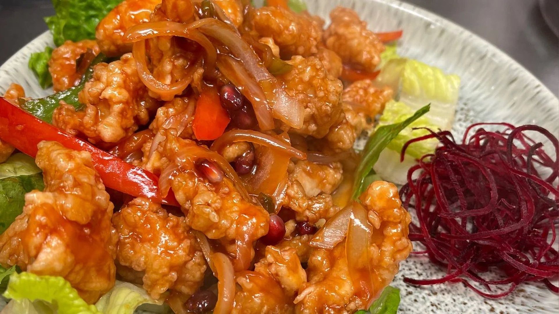 Breaded calamari deep fried, sautéed with onions, scallions, bell peppers and hot peppers with sweet chili sauce on the side