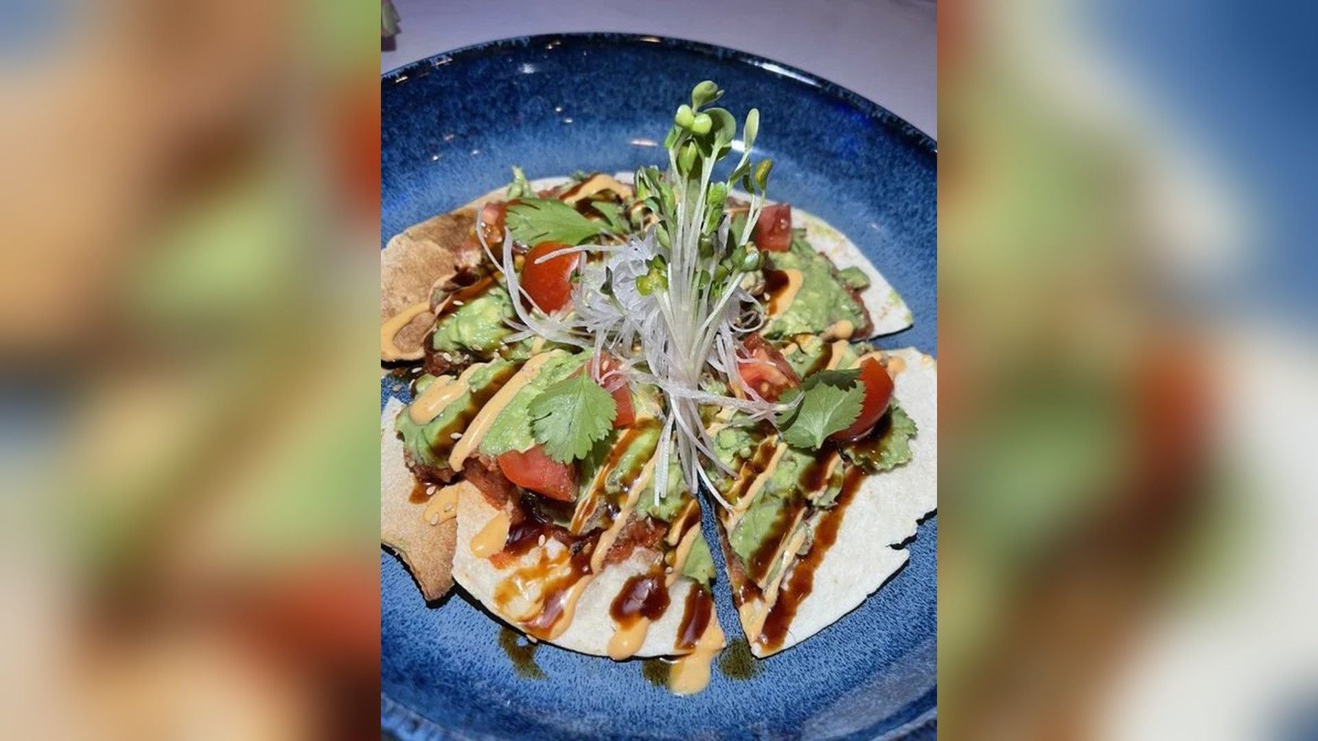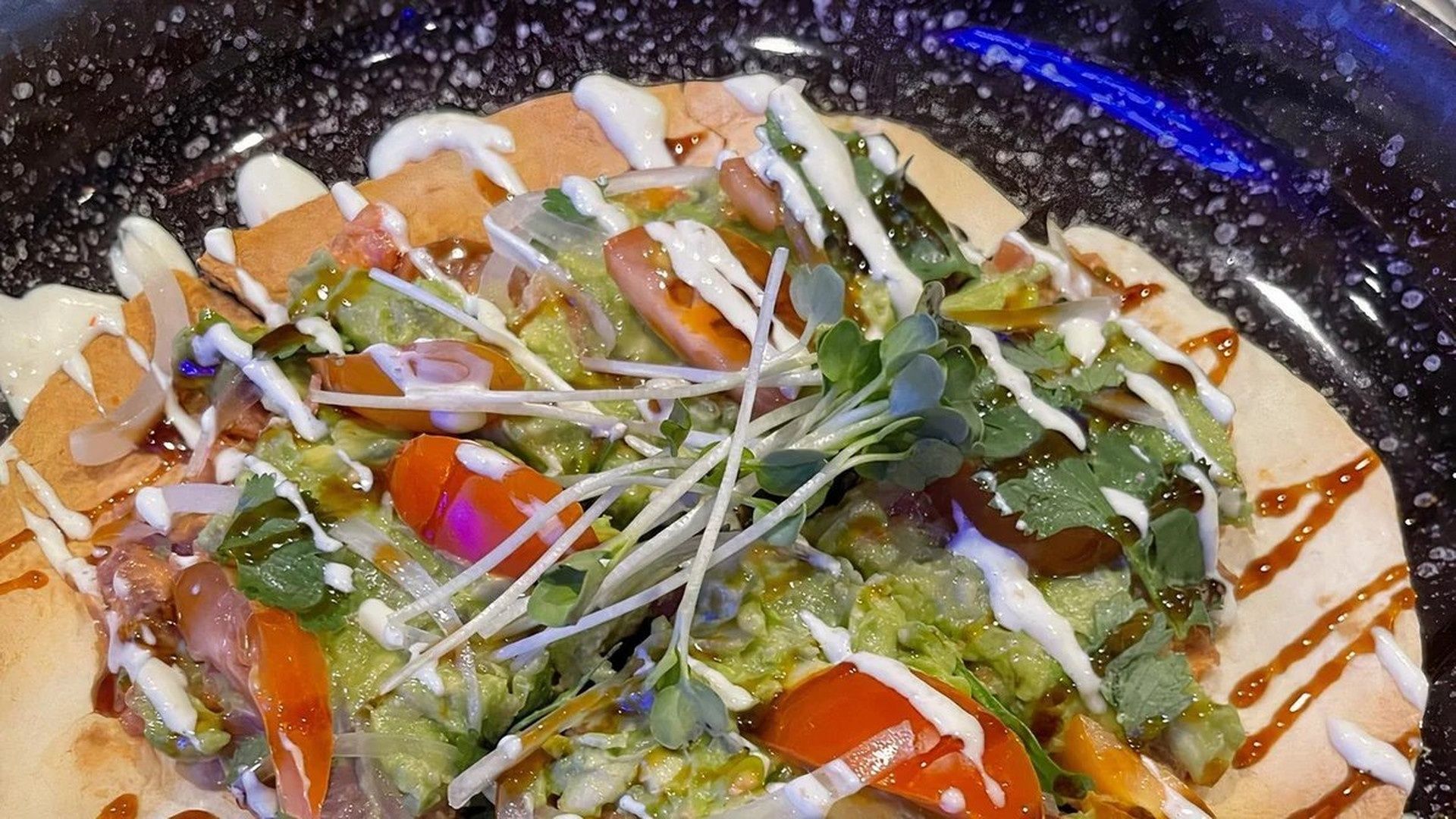 Spicy tuna, Avocado, cherry tomatoes, onions & cilantro on a bed of baked tortilla, topped with wasabi mayo & eel sauce