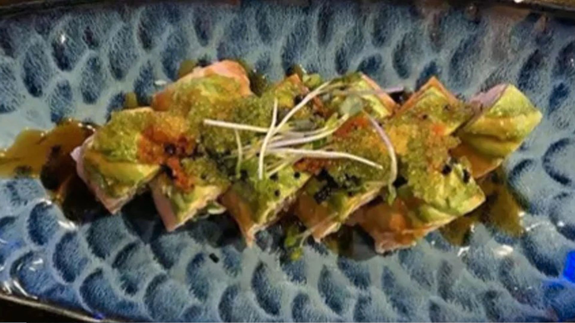 Kani, cucumber, avocado, cream cheese inside, with fresh salmon on top, basil sauce & eel sauce on top