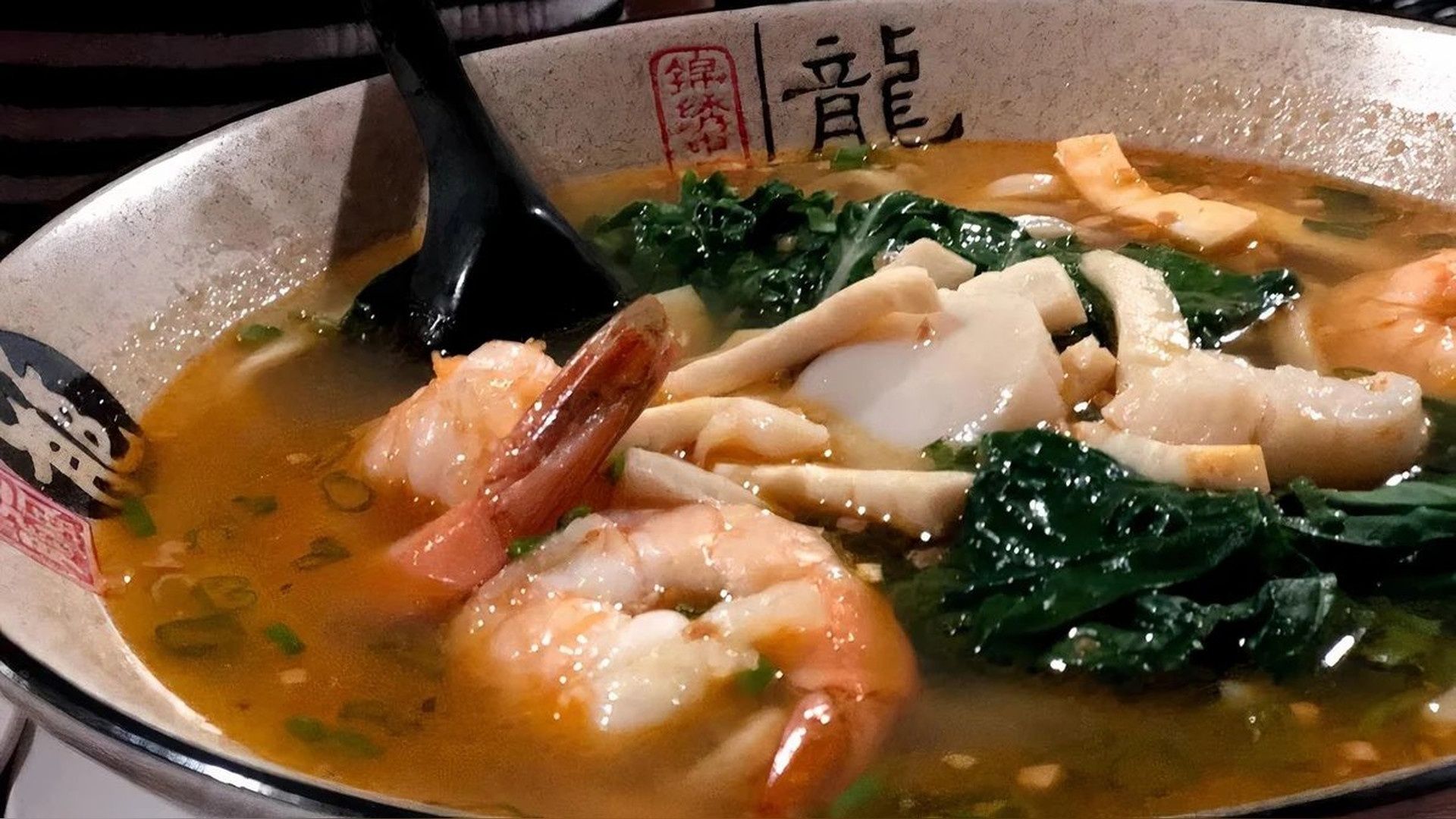 Japanese udon noodles with shrimp, scallops, calamari, Bok Choy, scallions, dry garlic in spicy chicken broth